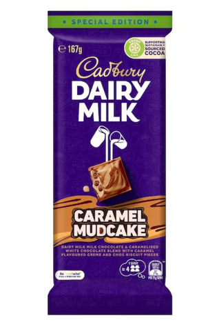 Cadbury Dairy Milk Special Edition Caramel Mudcake is a Dairy Milk milk chocolate & caramelised white chocolate blend with caramel flavoured creme and choc biscuit pieces.