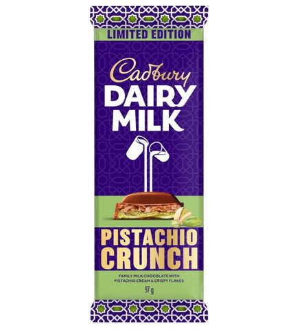 Family Milk Chocolate (50%) with Pistachio Creamy Filling (43%), Crunchy Wheat Flakes (7%). INGREDIENTS: Family Milk Chocolate (50%). Ingredients: Sugar, Full Cream Milk Powder*, Cocoa Mass, Cocoa Butter, Non-Hydrogenated Vegetable Oils (5% Maximum) (Palm, Shea), Emulsifiers from Vegetable Source (E442, E476), Natural and Artificial Flavours (Butter, Vanillin). Family Milk Chocolate: Milk Solids 20% Minimum. Cocoa Solids 20% Minimum. Contains Vegetable Fats In Addition To Cocoa Butter. * Full Cream Milk Powder Is Equivalent Of Glass And A Half Milk In Every 200 g Of Cadbury Dairy Milk Chocolate. Pistachio Creamy Filling (43%). Ingredients: Non-Hydrogenated Palm Oil, Roasted Grinded Pistachios (12%), Sugar, Whey Permeate Powder (From Milk), Full Cream Milk Powder, Corn Starch, Emulsifier from Vegetable Source (E322-Soya lecithin) Crunchy Wheat Flakes (7%). Ingredients: Sugar, Wheat Flour, Butter (From Milk), Lactose (From Milk), Milk Protein, Salt, Barley Malt Extract, Raising Agent (E500(ii)).