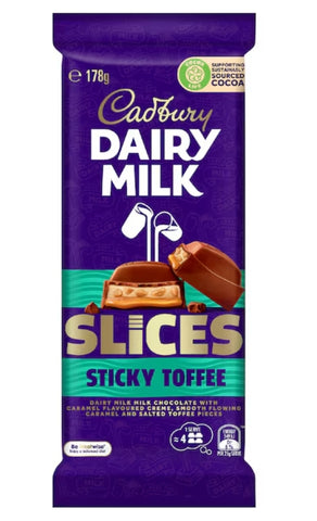 Cadbury Dairy Milk Slices Sticky Toffee is a delicious combination of Cadbury Dairy Milk milk chocolate with caramel flavoured creme, smooth flowing caramel and salted toffee pieces.