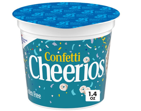 It's a party in a cup - and your taste buds are invited! Grab a cup of Confetti Cheerios when you're on the go. This individual cup of gluten free, sweetened whole grain oat cereal delivers the taste of vanilla, with yummy rainbow sprinkles in every crunchy O. Grab a cup for an easy part of a quick breakfast the entire family will love. Delicious with or without milk, open a cereal cup for the perfect addition to mealtime, snack time, or anytime in between; it makes a great pre-portioned treat for the backpack, bus, or car. This cereal has 12 vitamins and minerals, and contains no artificial flavors and no colors from artificial sources. Every day can be a celebration with these crunchy whole grain cereal Os. Contains one single serve plastic cup of crunchy Confetti Cheerios Single Serve Cereal Cup, 1.4 oz; perfect for instant snacking, or a part of breakfast and meals.