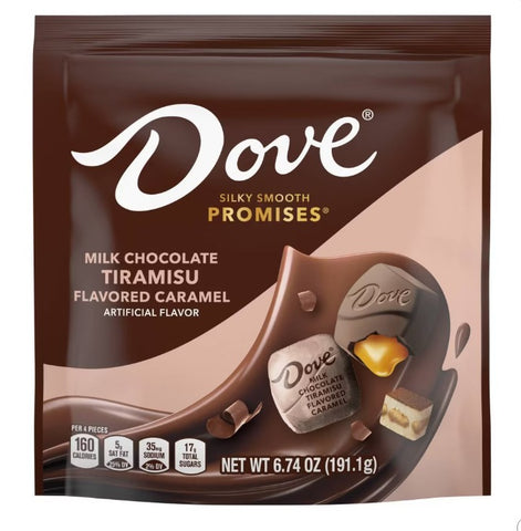 It's time to treat yourself to dessert in just one bite. DOVE makes it easy with our DOVE PROMISES Milk Chocolate Tiramisu Caramel Candy. These PROMISES are made with silky smooth premium milk chocolate filled with luxurious Tiramisu flavored caramel. From making candy dishes pop with elegant foils, to upgrading your party favors, DOVE PROMISES Tiramisu Chocolates are the premium choice!
