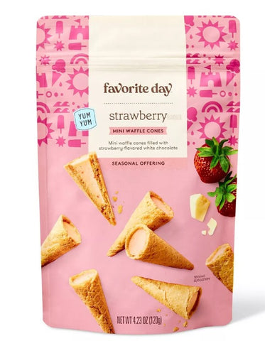 These Strawberry Mini Waffle Cones from Favorite Day™ are perfect for your next summer gathering. Filled with strawberry flavoured white chocolate, they are a variety of fun, summer-inspired flavors, these sweets and snacks are sure to be a hit for all ages.
