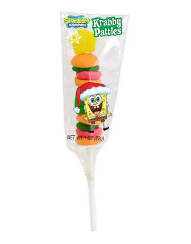 Frankford Nickelodeon Spongebob Krabby Patties Kabob Pop. This gummy Krabby Patties kabob is 1 ounce of Krabby Patties stacked together to form a kabob of delicious gummy candy. The gummy candies include holiday shapes including a green Christmas tree and yellow star on top. This Christmas will feel extra special when you gift each of your loved ones with a delicious gummy Krabby Patties kabob pop.