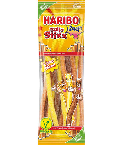 A lively trio! The delicious Haribo Balla Stixx Limo Mixx sour veggie inspires real sweet tooth with a great taste idea. The large fruit gummy sticks taste of cola, orange and lemon and seduce with a delicious confectionery filling. With their pleasantly sour taste, they are a refreshing treat for any occasion.