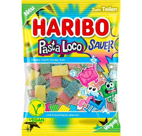 Haribo Pasta Loco Sour provides a fruity and sour taste experience in strip form. The colorful gummy pieces come in various colors and flavors such as Tropical, Blueberry, Grapefruit, and Lime, and are coated with an intense, sour sugar layer.