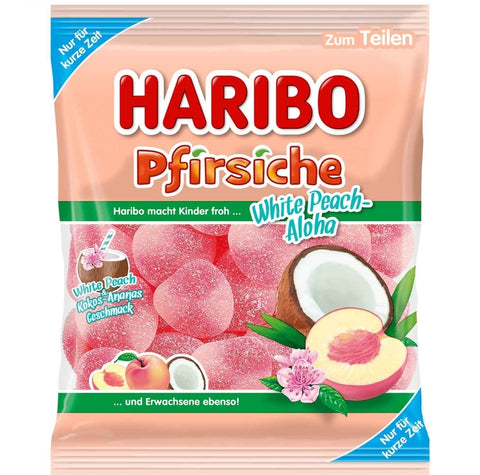 Summery fruity delight with a tropical touch! Haribo White Peach-Aloha peaches combine the sweet taste of white peach with exotic pineapple and a hint of coconut. Their soft texture and fruity sweetness make them a special snacking experience. Perfect for anyone who wants to indulge in a little tropical feeling!