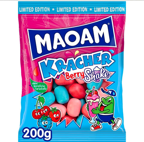 Maoam Kracher Berry Shake bring fruity milkshake enjoyment to the world of chewy candies – naturally with the popular crunch. The crispy shell conceals a fizzy filling that provides a surprising sensation when chewing. In this limited edition, the popular berry flavors of cherry, strawberry, and blue raspberry meet a creamy-sweet taste reminiscent of colorful milkshakes. These vibrant candies are not only visually appealing but also offer a delightful variety of flavors. Ideal for sharing, snacking, or as a sweet eye-catcher at any party.