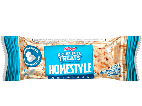 Discover a delicious take on a classic sweet snacking option with Rice Krispies Treats Homestyle Original crispy marshmallow squares. We've taken puffed rice cereal and mini marshmallows to craft our thickest, gooiest homestyle recipe. Every 33g bar is 50% bigger than our Original 22g bar and packed with pockets of melted marshmallows from top to bottom. The result is in our thickest, gooiest homestyle bar for a dessert experience that feels homemade. Satisfy your sweet craving with delicious flavor and convenience for kids and adults snack time. These deliciously chewy individual marshmallowy bars are made with crispy rice cereal and the taste of soft, gooey marshmallows for a treat bar the whole family will love.