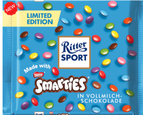 Finally back, and only for a short time: after 20 years, this much-requested new edition is making a big comeback! Two popular brands come together and once again create an incredibly delicious chocolate bar. Cheerful, colorful Smarties chocolate beans meet melt-in-the-mouth milk chocolate from Ritter Sport