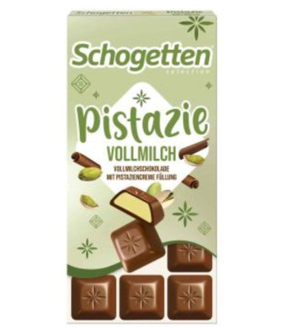 A classic with a nutty twist. The Schogetten Pistachio Milk combines melt-in-the-mouth milk chocolate with a creamy pistachio filling to create a particularly fine taste experience. Each small cube is filled with a gentle, slightly sweet pistachio cream that harmonizes perfectly with the milky chocolate shell. The combination ensures a balanced mixture of creamy texture and nutty aroma. Practically pre-portioned, the pieces can be ideally divided or enjoyed piece by piece.