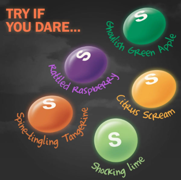 You know it's Halloween time when you spot that "Beware" sign! If you're after a new flavor thrill this spooky season, look no further than SKITTLES Shriekers Sour Halloween Candy. It's got the classic chewy bites you love, but watch out - there's a surprise! You will also find HIDDEN SUPER SOUR Shriekers sour candy pieces mixed into each pack! SHRIEK-or-Treat! Grab some SKITTLES Shriekers Fun Size Halloween Candy this Halloween, but don't say we didn't warn you! Shocking Lime, Spine-tingling Tangerine, Citrus Scream, Rattled Raspberry & Ghoulish Green Apple flavors!
