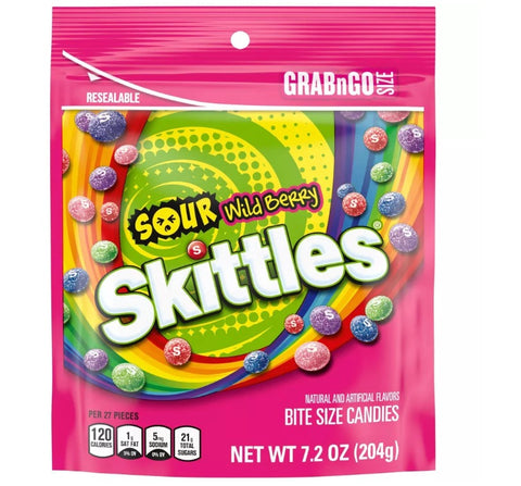 Pucker up! Enjoy the tangy thrill of SKITTLES Wild Berry Sour Chewy Candy. Each candy bag is bursting with electrifying fruit flavors, including sour berry punch, sour melon berry, sour raspberry, sour strawberry, and sour cherry. Your taste buds won't get enough of these zesty, bite-sized candies. Bring the perfect chewy pucker gaming sessions with friends. Whoever can hold the straight face the longest gets another shot at the controllers. Add a special fruity twist to your family movie night with this grab'n'go candy bag concession as a tangy treat. There's no wrong way to enjoy the face-wrinkling, mouth-puckering taste of SKITTLES Wild Berry Sour Chewy Candy.