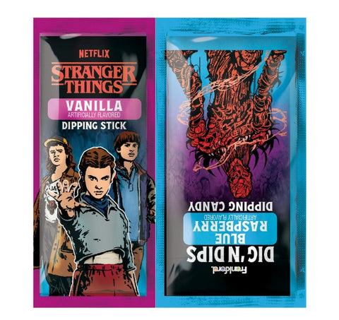 The Stranger Things Dig N' Dips Halloween Candy combines the thrill of the Upside Down with a sweet treat adventure! Each bag includes a packet complete with a vanilla candy stick and Blue Raspberry flavor dipping powders. Each decorative packet also highlights iconic Stranger Things characters and scenes, immersing fans in the eerie yet exciting world of Netflix's top streamed show.
