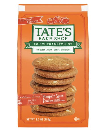 Celebrate fall with Tate's Bake Shop Pumpkin Spice Cookies. Uniquely thin and deeply delicious, these kosher cookies are loaded with white chocolate chips and comforting pumpkin spice flavors. The delightfully light, crisp texture makes these baked cookies perfect for sharing with friends or savoring for yourself. Arrange these pumpkin cookies on cookie trays for easy party snacks or desserts at autumn gatherings. These crispy, thin cookies are also a perfect accompaniment to a cold glass of milk or a hot cup of coffee. Each cookie bag is sealed to help maintain Tate's cookies' signature crispness and buttery deliciousness.