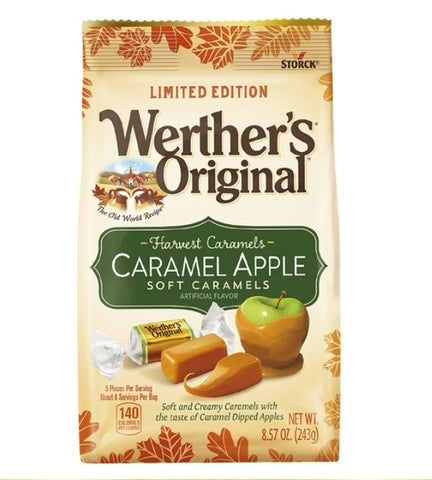Capture the flavors of fall with delicious Werther's Original Caramel Apple Soft Caramels. Werther's Original Soft Caramel Candy delivers classic Caramel flavor in our softest texture yet. Made with real butter and fresh cream, for a one of a kind taste. Storck Usa L.P. Shellfish-Free. Made with real butter and fresh cream, for a smooth taste that is one of a kind. Individually wrapped caramels perfect for sharing...or not.