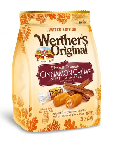 A delicious combination of our soft and buttery Werther's Soft Caramel with a cinnamon crème filling. Our soft and buttery Werther's caramel has a decadent crème filling for an unbeatable combination of flavors and textures. Werther’s Original is made with only the finest ingredients blended together with the same passion and care our first candy maker, Gustav Nebel, brought to every candy he crafted. Made with real butter and fresh cream, for a one of a kind taste. One 7.4 oz. bag of our soft Werther's caramel wrapped around a rich cinnamon crème filling. Gluten-Free.