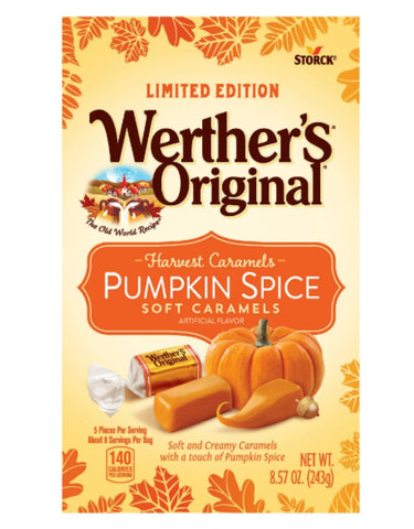 Capture the flavors of fall with delicious Werther's Original Pumpkins Spice Soft Caramels. Werther's Original Soft Caramel Candy delivers classic Caramel flavor in our softest texture yet. Werther’s Original is made with only the finest ingredients blended together with the same passion and care our first candy maker, Gustav Nebel, brought to every candy he crafted. Made with real butter and fresh cream, for a one of a kind taste. Shellfish-Free. One 8.57 oz bag of Werther's Original Caramel Candy.